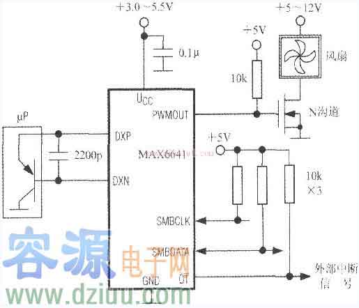 MAX6641的典型應(yīng)用電路如圖所示。這里是用PWMOUT端來驅(qū)動(dòng)N溝道MOSFET,進(jìn)而控制風(fēng)扇轉(zhuǎn)速的。遠(yuǎn)程PN結(jié)溫度傳感器可用微處理器(μP)內(nèi)部測(cè)溫三極管的發(fā)射結(jié)來代替。亦可選用CMPT3906、T3