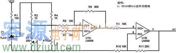 如圖所示為Pt100溫度傳感器電路圖。 放大電路采用LM358集成運(yùn)算放大器,為了防止單級(jí)放大倍數(shù)過高帶來的非線性誤差,放大電路采用兩級(jí)放大,如圖所示,前一級(jí)約為10倍,后一級(jí)約為3倍