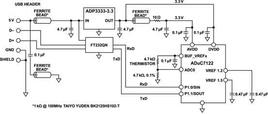 使用模擬MCU,LDO,外部熱敏電阻和一些分立器件,您可以構(gòu)建高精度的溫度傳感應(yīng)用。圖1中的電路顯示了Analog DevicesADuC7122精密模擬微控制器的工作原理可用于精確的熱敏電