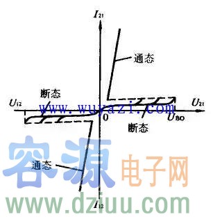 由圖可見,雙向晶閘管的特性曲線是由一、三 兩個象限內的曲線組合成的。第一象限的曲線說明當加到主電極上的電壓使T2對T1的極性為正時,我們稱為正向電壓,并用符號U21表示。當這個電壓逐漸增加到等于轉折電壓UBO時,左邊的晶閘管導通見圖6.37 (b),這時的通態電流為I21,方向是從T2流向T1。從圖中可以看到,觸發電流越大,轉折電壓就越低,這種情形與單向晶閘管的觸發導通規律是一致的。