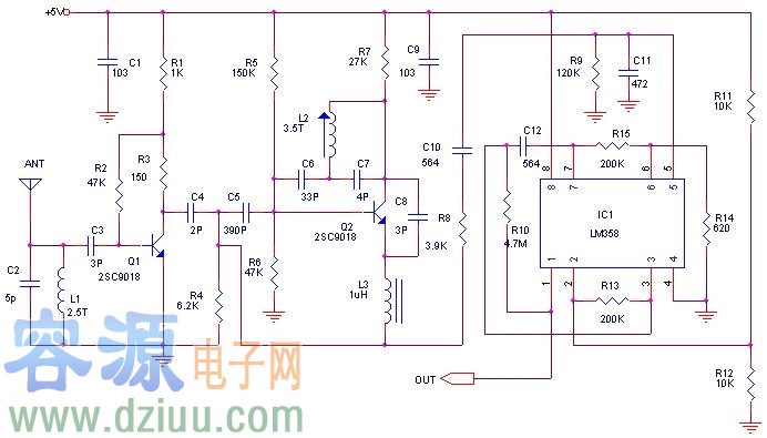 如圖所示為典型的超再生接收電路。接收機可使用超再生電路或超外差電路,超再生電路成本低,功耗小可達100uA左右,調整良好的超再生電路靈敏度和一級高放、一級振蕩、一級混頻以及兩