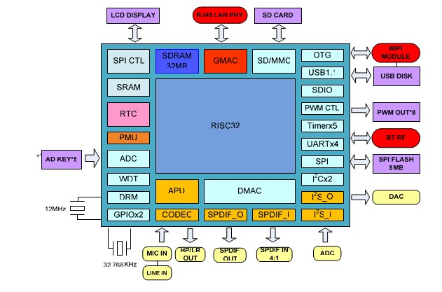 SC6138A 是一顆高集成度,專注于無線音樂、音頻編解碼、音效處理的 SoC 芯片。它集成了 APU 單元,專門來 處理音頻相關的算法,同時還將音頻 DAC/ADC、音頻接口、USB/SD/以