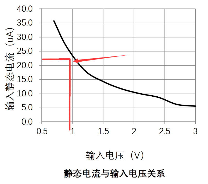 從芯片的輸入電源和輸入靜態電流的表格可以看到,1V時的靜態功耗是20uA多,隨著輸入電壓變大,靜態功耗會變小。