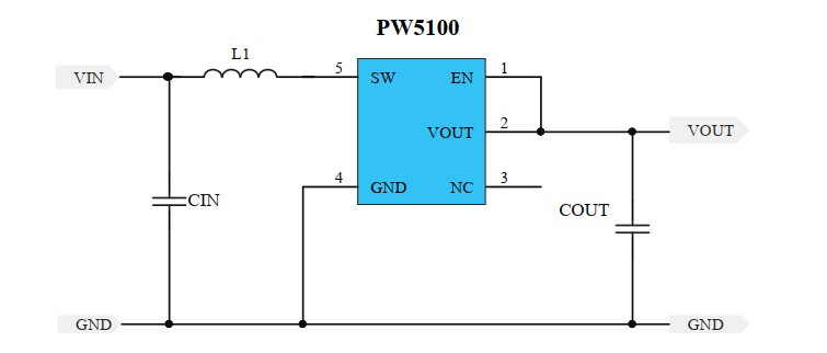 PW5100 的工作頻率高達 1.2MHz,其目的是為了能夠減小外部的電感尺寸和輸出電容容值,故 PW5100 只需要 1uH 以上的電感就可以保證正常工作,
