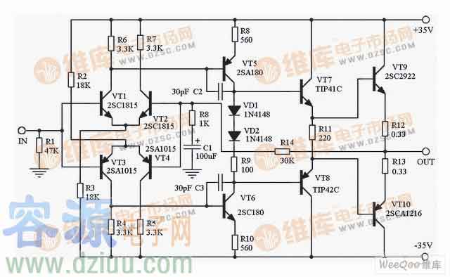 由運放和多個晶體管組成的10W功率放大器電路原理圖