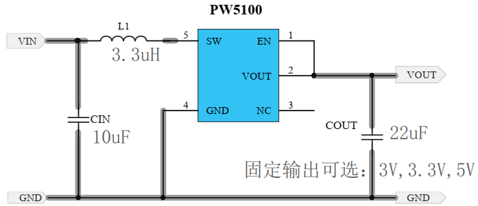 PW5100輸出電壓:3V,3.3V,5V固定值,最大開關電路1.5A