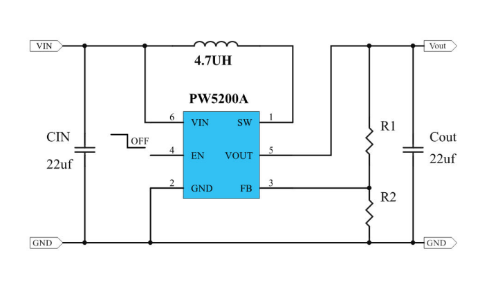 PW5200A工作頻率為1.4MHZ。輕載時(shí)自動PWM/PFM模式切換,提高效率。