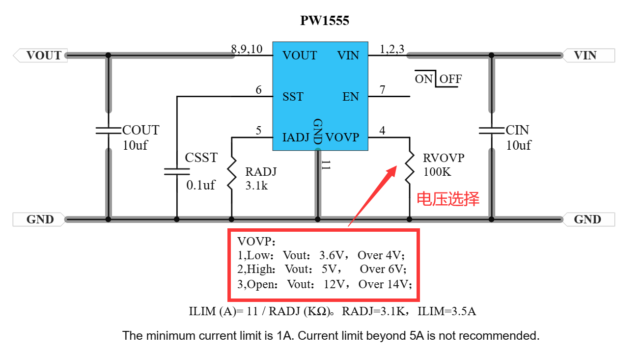 PW1555是一個可編程的限流開關,具有輸入電壓范圍選擇和輸出電壓鉗位。集成保護N溝FET的極低RDS(ON)有助于減少正常運行時的功率損耗。可編程軟啟動時間控制轉換率,在啟動