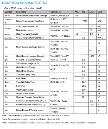 特征	VDS=-40V,ID=-5A	RDS(開)<70m&Om" />