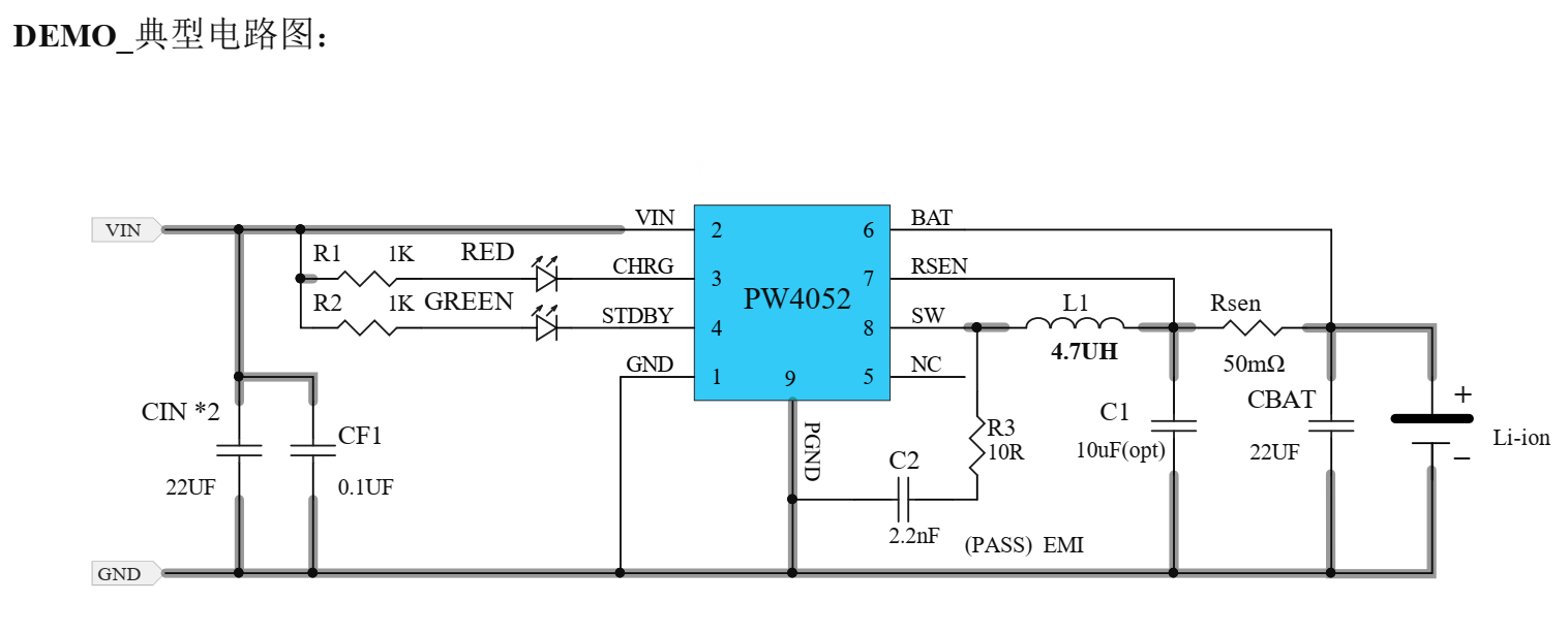 例如PW4052單節2.5A充電管理芯片的電路圖中的R3和C2。