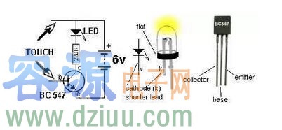 上面這個電路夠簡單吧?你可以得到,只要是NPN晶體管都可以使用。BC547三極管極性:字面朝上,左→右 C、B、E