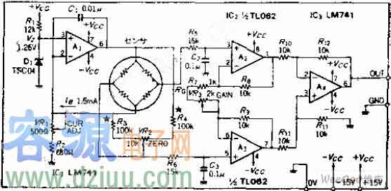 OP放大器A1為恒流輸出電路,電流大小由基準電壓VZ和傳感電阻決定,本電路用可變電阻的最大阻,否則OP放大器輸出會飽和、使工作不穩定。電橋電阻為為4.7K±30%,如果有1.5MA的偏流流過,就會產生最大為9.165V的等效電壓,A1必須輸出10.425V的電壓,該電壓是傳感電壓與電橋等效電壓相加。調零方法是使電橋略不平衡,輸出一定的電壓進行調零。如果用下一級儀表放大器進行調零也行。平衡輸入放大器加了濾除高頻噪聲的緩沖濾波器,時間常數根據最高響應頻率確定。
