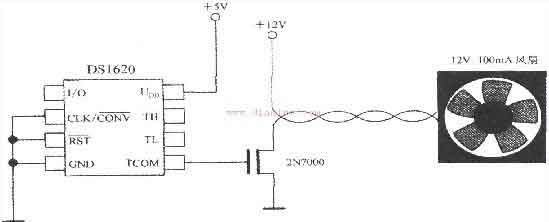 用DS1620監控微處理器的溫度時,通過開啟或關閉風扇,可改變芯片的散熱條件,實現恒溫控制,電路如圖所示。其特點是將TCOM信號經過2N7000型MOSFET,去控制風扇,當芯片表面溫度t>tH時打開