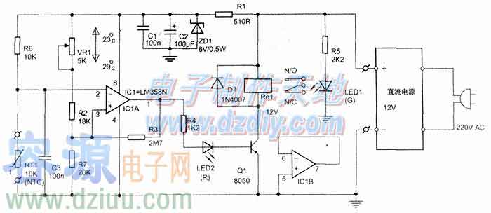 本電路是一個簡單的自動調溫器電路,可用于控制,通過繼電器觸點繼電器與供電的一個小空間加熱器。繼電器觸點的額定以上應為加熱器的電流要求。