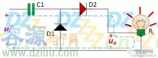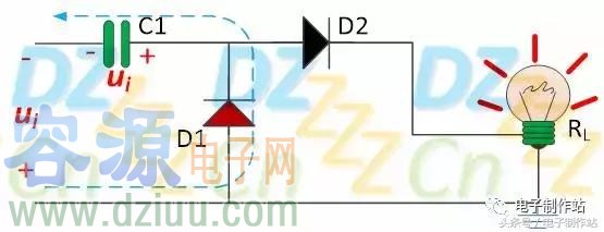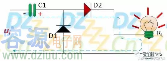 當(dāng)電壓ui的第一個(gè)正半周來到時(shí),電壓ui極性為上正下負(fù),電壓ui經(jīng)過電容C1給二極管施加反向偏置使其截止,同時(shí)給二極管D2正向" />