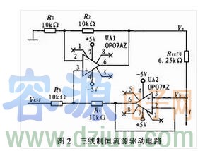 由于溫度對集成運放參數影響不如對晶體管或場效應管參數影響顯著,由集成運放構成的恒流源具有穩定性更好、恒流性能更高的優點。尤其在負載一端需要接地的場合,獲得了廣泛應用。所以采用圖2所示的雙運放恒流源。其中放大器UA1構成加法器,UA2構成跟隨器,UA1、UA2均選用低噪聲、低失調、高開環增益雙極性運算放大器OP07。