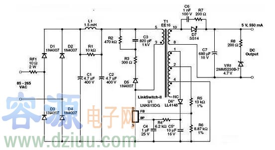 D5、R2、R3和C3組成RCD-R箝位電路,用于限制漏感引起的漏極電壓尖峰。電阻R3擁有相對較大的值,用于避免漏感引起的漏極電壓波形振蕩,這樣可以防止關斷期間的過度振蕩,從而降低傳導EMI。