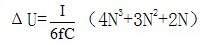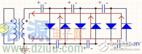 如果不帶負載,穩態時,除了最左邊的那個電容,其他每個電容上的電壓為2U,所以總的輸出電壓為6U。事實上,由于高階倍壓整流電路帶載能力很差,輸出很小的功率就會導致輸出電壓的大幅度跌落。假設輸出電流為I,每個電容的容量相同,為C,交流電源頻率為f,則電壓跌落為: