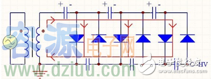 優點是每個電容上的電壓不會超過變壓器次級峰值電壓U的兩倍,即2U,所以可以選用耐壓較低的電容。缺點是電容是串聯放電,紋波大。