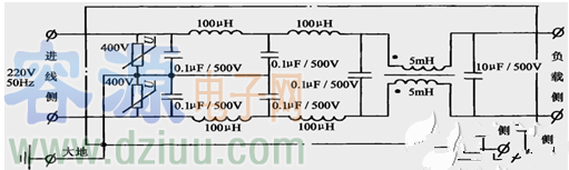 圖中的100H電感、0.1F電容組成高頻濾波器,用于吸收從電源線傳導(dǎo)進(jìn)來(lái)的中短波段的高頻噪聲干擾;圖中兩只對(duì)稱的5mH電感是由繞在同一只鐵心兩側(cè)、匝數(shù)相等的電感繞組構(gòu)成的,稱為共模電感,用于吸收因電源波形畸變而產(chǎn)生的諧波干擾;圖中的壓敏電阻用于吸收因雷擊等引起的浪涌電壓干擾。 交流電源濾波器的內(nèi)部電路。容-源-電-子-網(wǎng)-為你提供技術(shù)支持