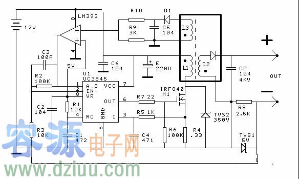 研制儀器需要一個(gè)能在0到3兆歐姆電阻上產(chǎn)生1MA電流的恒流源,用UC3845結(jié)合12V蓄電池設(shè)計(jì)了一個(gè),變壓器采用彩色電視機(jī)高壓包,其中L1用漆包線(xiàn)在原高壓包磁心上繞24匝,L3借助原來(lái)高壓包的一個(gè)線(xiàn)圈,L2借助高壓包的高壓部分。L3和LM393構(gòu)成限壓電路,限制輸出電壓過(guò)高,調(diào)節(jié)R10 可以調(diào)節(jié)開(kāi)路輸出電壓。