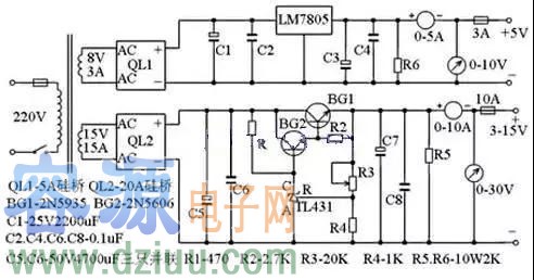 其工作原理分兩部分,第一部分是一路固定的5V1.5A穩(wěn)壓電源電路。第二部分是另一路由3至15V連續(xù)可調(diào)的高精度大電流穩(wěn)壓電路。第一路的電路非常簡(jiǎn)單,由變壓器次級(jí)8V交流電壓通過(guò)硅橋QL1整流后的直流電壓經(jīng)C1電解電容濾波后,再由5V三端穩(wěn)壓塊LM7805不用作任何調(diào)整就可在輸出端產(chǎn)生固定的5V1A穩(wěn)壓電源,這個(gè)電源在檢修電腦板時(shí)完全可以當(dāng)作內(nèi)部電源使用。