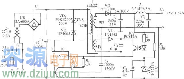 2、TOP224P構(gòu)成的12V、20W開(kāi)關(guān)直流穩(wěn)壓電源電路