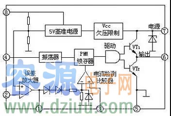當(dāng)基準(zhǔn)穩(wěn)壓源有5V基準(zhǔn)電壓輸出時(shí),基準(zhǔn)電壓檢測(cè)邏輯比較器即達(dá)出高電平信號(hào)到輸出電路。同時(shí),振蕩器將根據(jù)④腳外接Rt、Ct參數(shù)產(chǎn)生 f=/Rt.Ct的振蕩信號(hào),此信號(hào)一路直接加到圖騰柱電路的輸入端,另一路加到PWM脈寬市制RS觸發(fā)器的置位端,RS型PWN脈寬調(diào)制器的R端接電流檢測(cè)比較器輸出端。R端為占空調(diào)節(jié)控制端,當(dāng)R電壓上升時(shí),Q端脈沖加寬,同時(shí)⑥腳送出脈寬也加寬(占空比增多);當(dāng)R端電壓下降時(shí),Q端脈沖變窄,同時(shí) ⑥腳送出脈寬也變變窄(占空比減小)。