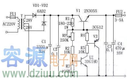 元器件選擇:變壓器T選用80W~100W,輸入AC220V,輸出雙繞組AC28V。FU1選用1A,F(xiàn)U2選用3A~5A。VD1、VD2選用 6A02。RP選用1W左右普通電位器,阻值為250K~330K,C1選用3300?F/35V電解電容,C2、C3選用0.1?F獨(dú)石電容,C4選用 470?F/35V電解電容。R1選用180~220Ω/0.1W~1W,R2、R4、R5選用10KΩ、1/8W。V1選用2N3055,V2選用 3DG180或2SC3953,V3選用3CG12或3CG80