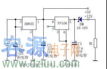 兩節(jié)1.5V堿性電池輸出的3V電壓輸入AH805,AH805輸出+5V電壓,其一路作5V輸出,另一路輸入FP106使其產(chǎn)生28~30V電壓,經(jīng)穩(wěn)壓管穩(wěn)壓后輸出+12V電壓。