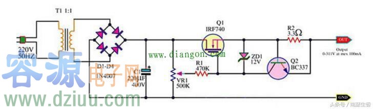 0-300v可調(diào)輸出電路,這個電路為了與市電隔離加了一個1:1的變壓器,可以不用這個變壓器而直接輸入市電,當(dāng)然安全上會降低,但不影響使用。