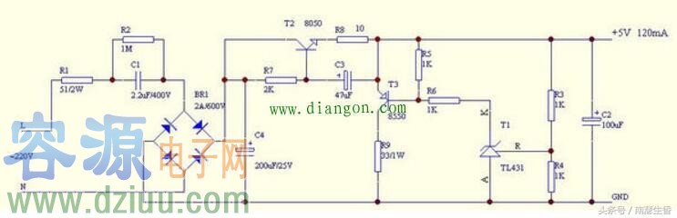 電容降壓的5V直流穩(wěn)壓電源下面這個電源,最大可以提供約120mA電流: