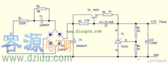 電容降壓的5V直流穩(wěn)壓電源,下面這個電源,最大可以提供約55mA電流: