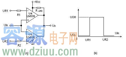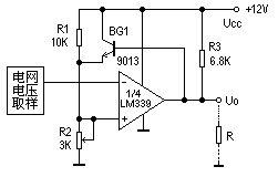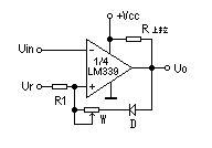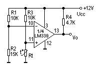 圖3為某儀器中過熱檢測保護電路。它用單電源供電,1/4LM339的反相輸入端加一個固定的參考電壓,它的值取決于R1于R2。UR=R2/(R1+R2)*UCC。同相端的" />
