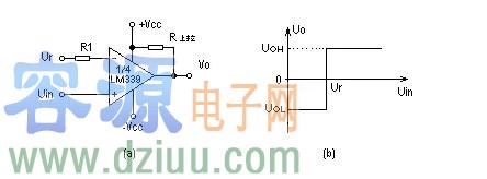 圖3為某儀器中過熱檢測保護(hù)電路。它用單電源供電,1/4LM339的反相輸入端加一個固定的參考電壓,它的值取決于R1于R2。UR=R2/(R1+R