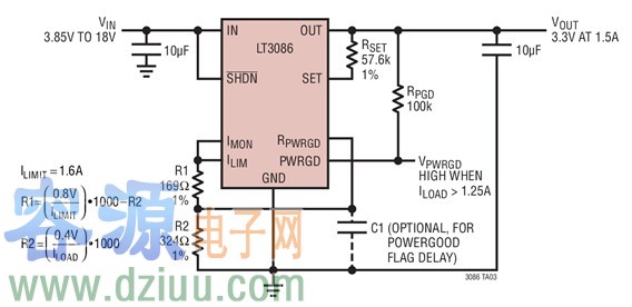 LT3086 的可編程電纜壓降補償可消除由至負載的阻性連接所引起的輸出電壓誤差。一種主/ 從配置允許并聯多個器件以提供較高的負載電流和散熱量,而無需使用外部鎮流電阻器。輸出電流和溫度監視以及一個電源良好標記提供了系統診斷和調試能力。內部故障保護電路包括熱停機和具折返的電流限制。另外,熱限值和電流限值也可以在外部設置。如下圖所示。
