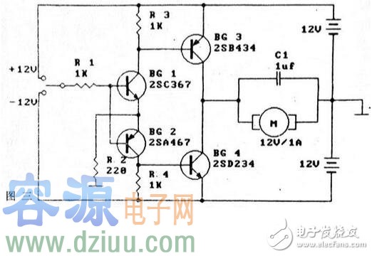 圖1電路利用了達林頓《m.flswjt.cn》晶體管擴大電機驅動電流,圖示電路將BG1的5A擴流到達林頓《m.flswjt.cn》復合管的30A,輸入端可用低功率邏輯電平控制。上述電路采用的驅動方式屬傳統的單臂驅動,它只能使電機單向運轉,雙臂橋式推挽驅動可使控制更為靈活。