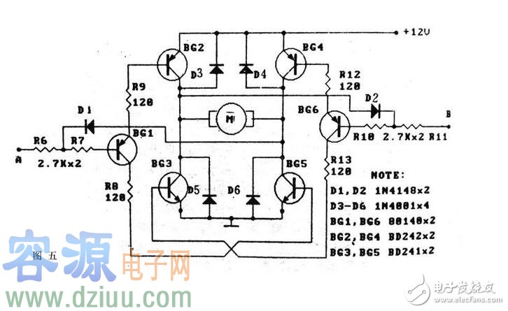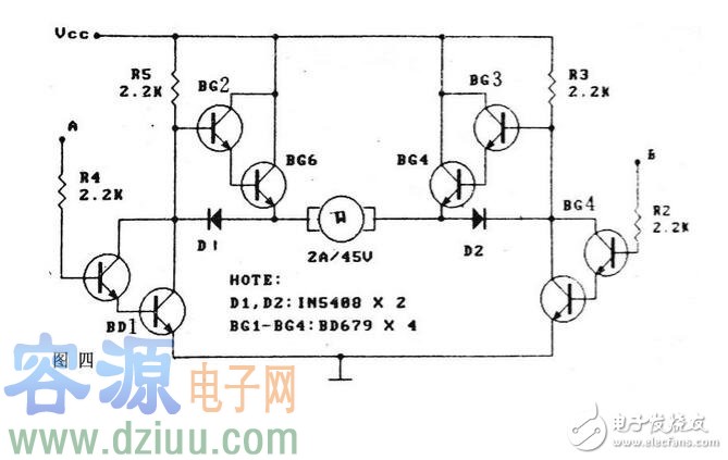 圖4電路以達林頓《m.flswjt.cn》管為基礎驅動電機的正反轉,它由完全對稱的兩部分組成。當A、B兩輸入端之一為髙電平,另一端為低電平時,電機正轉或反轉;當兩輸入端同為高或低電平時,電機停轉;如采用脈寬調制,則可控制電機的轉速,因此圖4具有四種組合輸入狀態,電機卻可以產生五種運行狀態。這里箝位二極管D1、D2的加入具有重要的作用,它使達林頓《m.flswjt.cn》管BG2,BG3不會產生失控,這在大功率下運轉時更顯安全。本電路的另一特點是輸入控制邏輯電平的高低與電機的直流工 作電壓無關,用TTL標準電平就能可靠地控制。