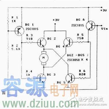 圖2為一款單端邏輯輸入控制的橋式驅動電路,它控制電機正反轉工作,這個電路的另一個特點是控制供電與電機驅動供電可以分開,因此它較好地適應了電機的電壓要求。