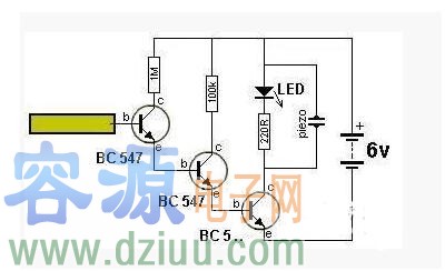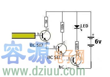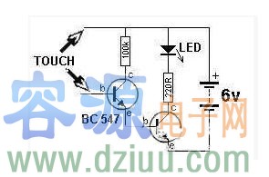 這是第二個最簡單的電路。已添加第二個晶體管將你的手指傳遞的電流進行放大。該晶體管的增益約200,你的手指只需輕輕觸摸圖中的兩個點,LED就會被點亮。增添的三極管將通過你的手指的電流放大了約200倍再提供給原三極管,總放大倍數約40000倍。