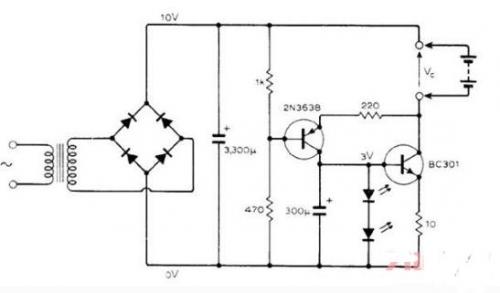 在恒定電流的系列里,給四個(gè)尺寸是 D 的電池充電,并且?guī)в凶詣?dòng)電壓限制。BC301 晶體管作為電流源,并且?guī)в谢鶚O電壓,這個(gè)電壓用 2 個(gè) LED 穩(wěn)定在大約 3V。LED 也用來(lái)顯示充電狀態(tài)。