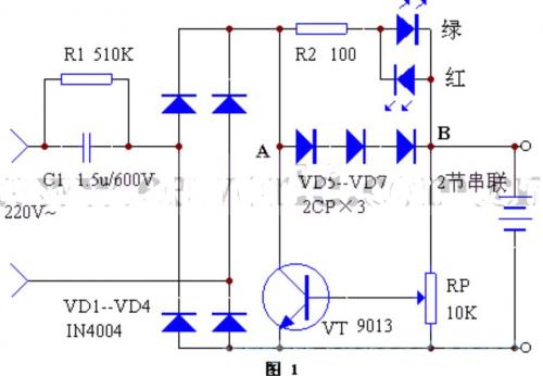 工作原理:電路原理見圖 1(電容 C1、二極管 VD1-VD4 構成降壓(限流)、整流電路。由于電容的內阻很大,則輸出近似為恒流,經二極管 VD5-VD7 給電池充電,并在 VD5-VD7 上產生約 2.1V 的電壓降使發光二極管發光(綠色),作為充電指示。三極管 VT 和電位器 RP 組成自動保護電路。當電池充滿后,VT 飽和導通,自動切斷充電電流。同時 A 點電位下降至 0.5V 左右,這時,VB>VA,使紅色發光二極管發光,表示充電結束。