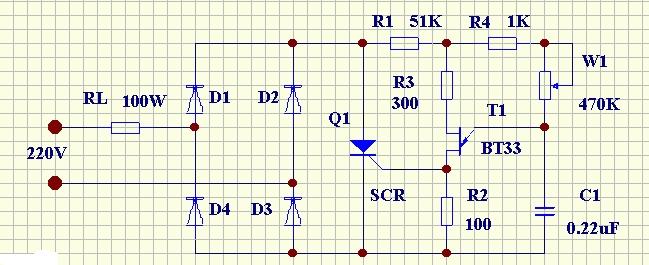 可控硅的同步觸發電路。當調壓器接上市電后,220V交流電通過負載電阻RL經二極管D1—D4整流,在可控硅SCR的A、K兩端形成一個脈動直流電壓,該電壓由電阻R1降壓后