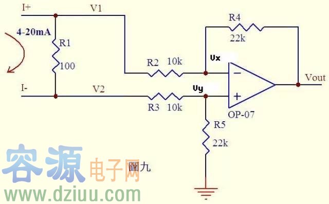 分析一個大家接觸得較多的電路。很多控制器接受來自各種檢測儀表的0~20mA或4~20mA電流,電路將此電流轉換成電壓后再送ADC轉換成數字信 號,圖九就是這樣一個典型電路。如圖4~20mA電流流過采樣100Ω電阻R1,在R1上會產生0.4~2V的電壓差。由虛斷知,運放輸入端沒有電流流 過,則流過R3和R5的電流相等,流過R2和R4的電流相等。故: