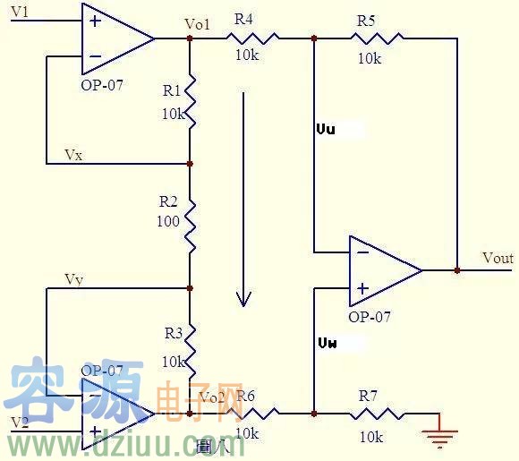 由dh得 Vout = (Vy –Vx)(R1+R2+R3)/R2 上式中(R1+R2+R3)/R2是定值,此值確定了差值(Vy –Vx)的放大倍數。