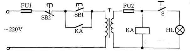 工作原理:閉合S后,按下按鈕SB1,變壓器得電輸出36V低電壓,使得繼電器或交流接觸器KA吸合。放松按鈕SB1后,KA自鎖觸點使KA保持吸合,繼續給變壓器接通電源。如果變壓器次級發生短路故障,繼電器線圈電壓為零,此時KA便失電釋放,將變壓器電源斷開,保護變壓器不被破壞。