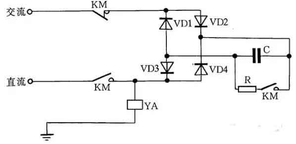 快速退磁的工作原理是:直流電磁鐵斷電后,交流電源通過橋式整流器和YA向電容C充電,隨著電容C兩端電壓的不斷升高,充電電流越來越小,而通過YA的電流又是交變的,從而使電磁鐵快速退磁。電容C的容量要根據電磁鐵的實際情況現場試驗決定。R為放電電阻。