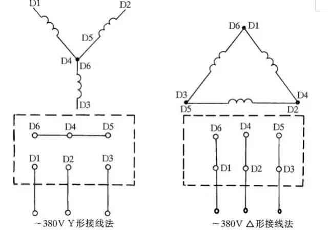 圖1 三相交流電動機Y形和△形接線方法