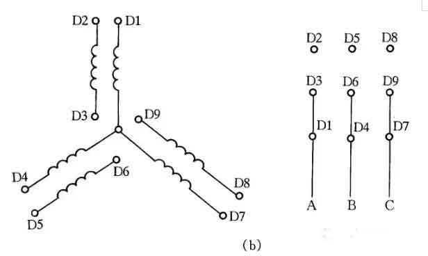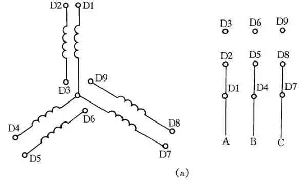 圖8所示是2Y/2Y電動機雙速定子線組的引出線接線方法。按圖8(a)連接是一種轉速,按圖8(b)連接得到另一種轉速。