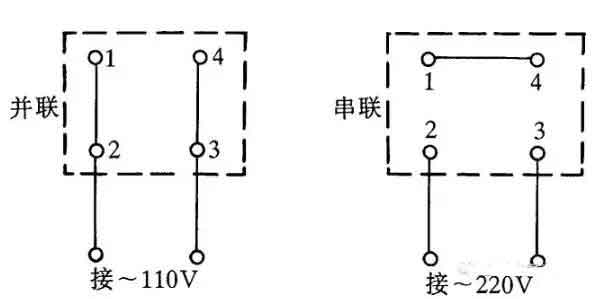 有的單相吹風機引出4個接線端子,接線方法如圖5所示。采用并聯接法應接入110V交流電源,采用串聯接法應接入220V交流電源。